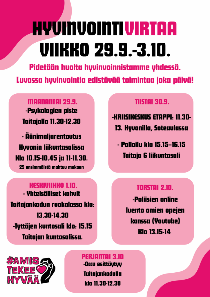 Opiskeluhuolto yhteistyössä yhteisöpedagogien kanssa on järjestämässä Hyvinvointivirtaa viikkoa 29.9.–3.10.2025. Kyseessä on perinteinen tapahtuma, jossa viikon aikana pidetään erilaisia tapahtumia mm. luentoja ja toimintapisteitä.